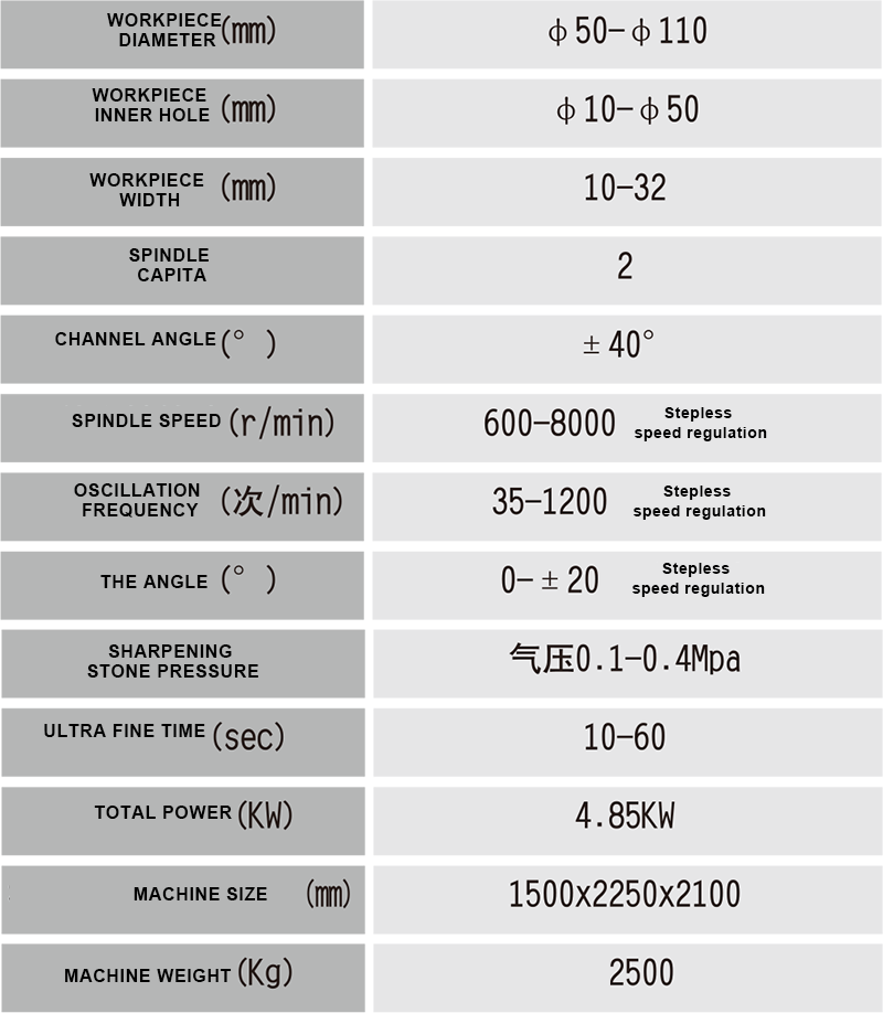 • the workpiece is superfine at the simplex, with coarse whetstone and fine secondary pressure. Whetstone consumption automatic compensation, whetstone too short alarm.